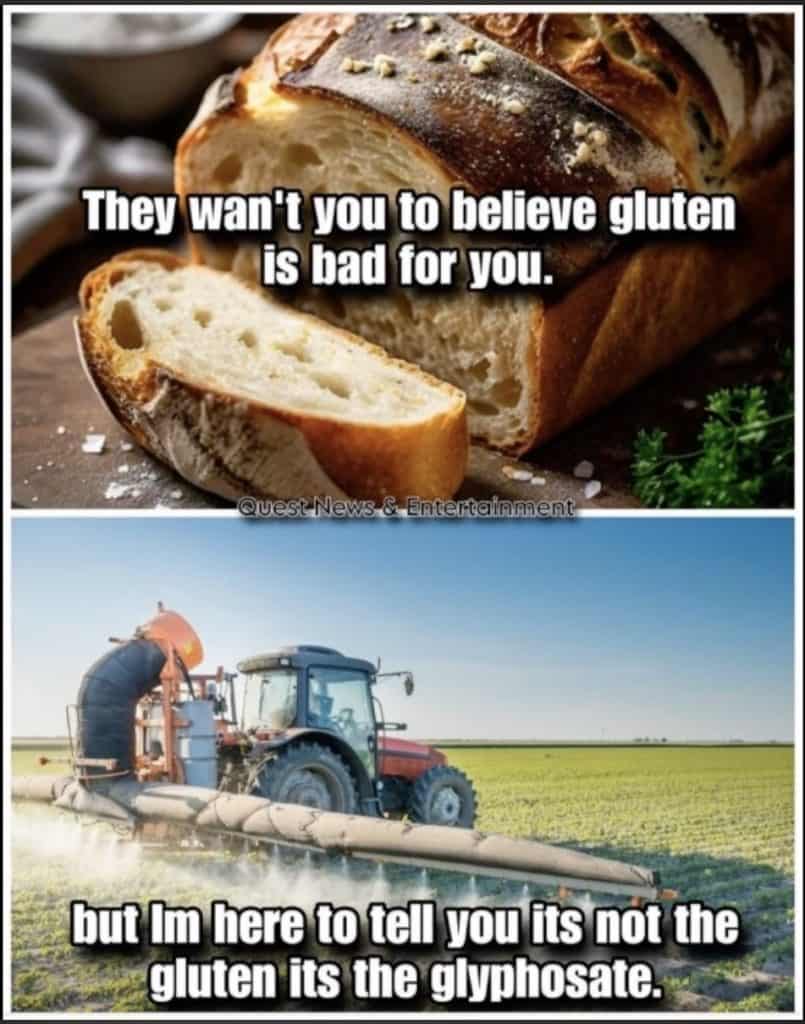 So, as the meme on this page is suggesting, gluten itself may not be the main culprit but rather the glyphosate residue in wheat products, which could be causing gut inflammation and immune reactions. This aligns with why many people feel fine eating bread in Europe but struggle with it in the U.S.
